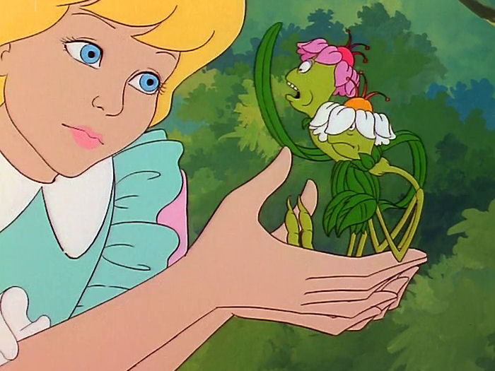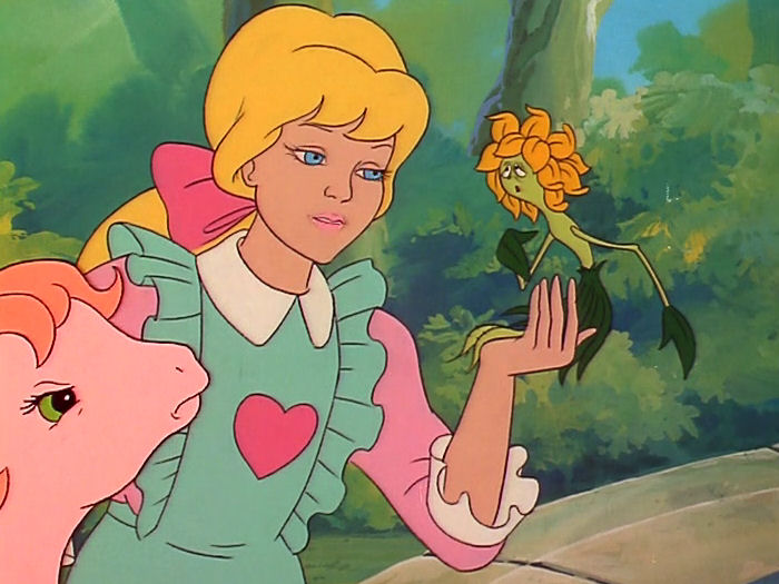 Megan is aghast that flowers move and talk. [bat: Megan has apparently never read or watched any version of Alice in Wonderland.] She immediately picks them up to talk to them. STOP GRABBING AT SENTIENT BEINGS, MEGAN. DON’T JUMP ON PONIES’ BACKS LIKE THEY’RE BEASTS OF BURDEN. DON’T GRAB SMALL ANIMALS THAT ARE HAVING A CONVERSATION. JUST FUCKING LEAVE SHIT ALONE.