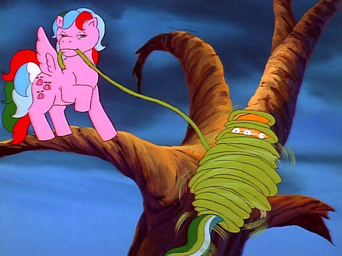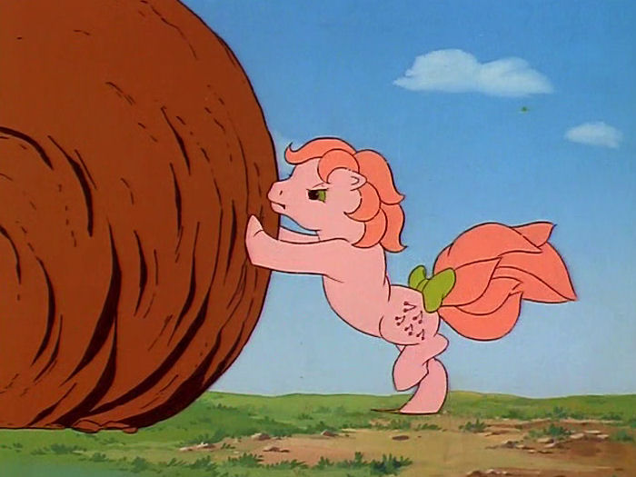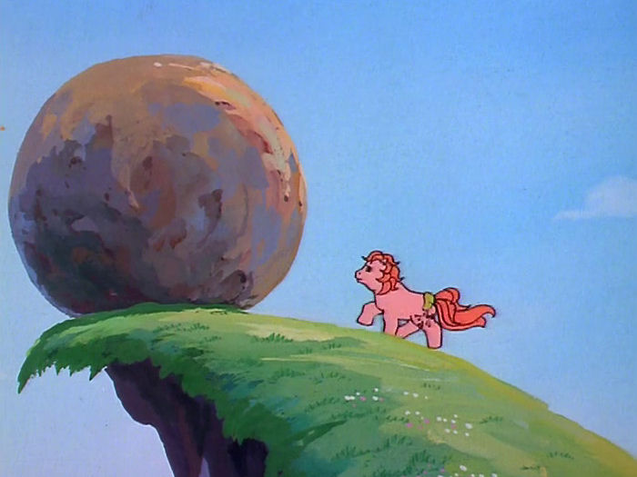 Cut to the ponies dragging the crabs on trollies along some terrifying rocky place – maybe it’s where Midnight Castle was? – while the crabs explain that they’re police, and the Flouries are escaped convicts. Also, they constantly refer to the ponies and Megan as “ma’am”, which I find charming. They say the Flouries will ruin the soil, and there will be nothing left but brown dirt. So… soil? (I do kind of get what he’s saying, but it just sounds silly.)