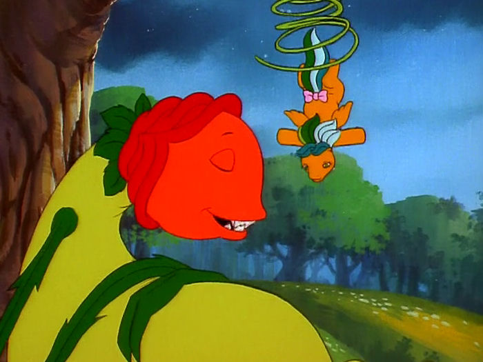 After she’s done singing a very pointless song that fails to move the plot along, the Flouries approach on hands and knees [bat: leaves and stems/roots?], saying they need water and fertile soil. Posey says they’re half-starved and asks how she can help. Are you kidding me? You just did a song about how to tend to a garden, you muppet. You should know this.