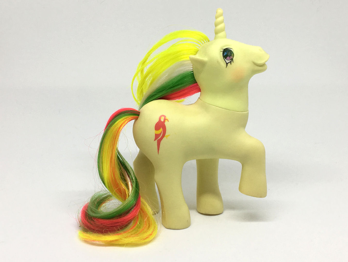 At that point, finding her was hard. I don’t think, based on the colours, these were very popular with girls. I don’t think they were produced in near the same numbers as the original TE Ponies. Face it, initially, you’re going to see a pea green Pony with a red Macaw as her cutie mark and think “wtf was the designer smoking?” Plus they chose a mold with a pose that was notoriously difficult to make stand on its own. Great going, Hasbro!
