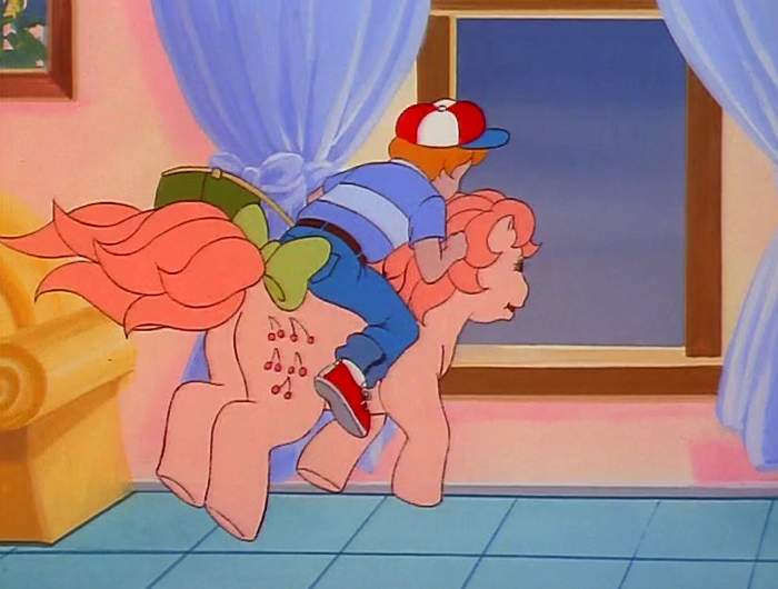 Danny then rides Cherries Jubilee into Paradise Estate, whooping like a moron, and snags his bag, which is not a backpack, but a messenger bag. And you’re right, now I’m just being a dick with the nit-picks. The Troggles block their exit, so Danny says, “The window!” and Cherries Jubilee bolts for it. Oddly, the ground is at the same level as the windowsill, which is just plain weird. [bat: What does size and relativity matter in Pony Land!]