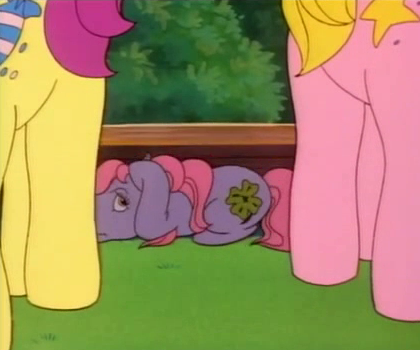 [bat: Clover sings, “My head just starts to ache!” and she has accurately captured what happens every time I have to listen to a Pony song. I also love that she only names BON-BON, Bright Eyes, and MELODY, and refers to her three other friends as “one of the other three.” REAL FRIENDSHIP RIGHT THERE ON DISPLAY.]